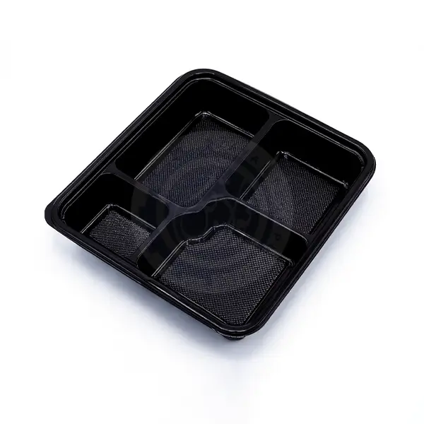 ظرف مربعی چهارخانه از جنس PP با درب PET شفاف، مناسب برای بسته‌بندی غذای بیرون‌بر، رستورانی و کترینگ. موجود در دو رنگ مشکی و قرمز-مشکی، مقاوم در برابر حرارت و قابل استفاده در مایکروویو (بدون درب).